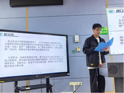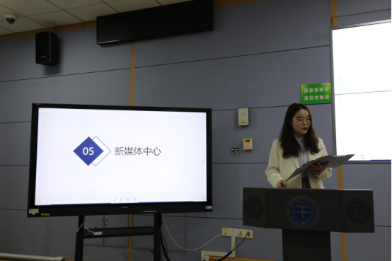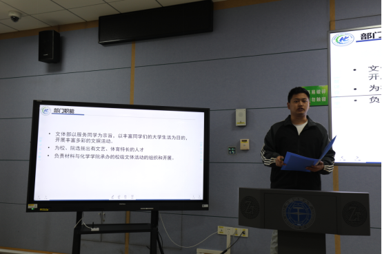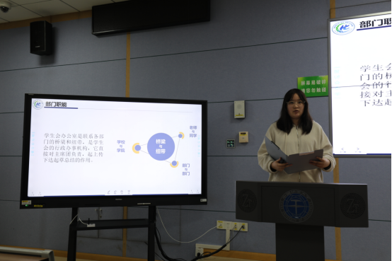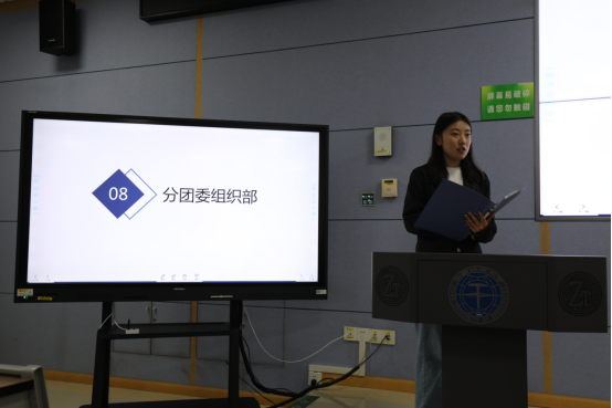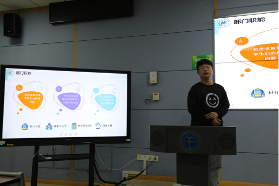 紧跟着,各学生组织负责人依次对相关部门进行详细的介绍。综合事务部马佳琪、学务部谭羽彤、文体部田斌,生活权益服务部徐钦、新媒体中心储迎宇、科学与技术协会王泽仲、志愿者协会周靖昂和分团委组织部刘泽倩从部门主要职能、工作具体内容、重大工作项目的时间轴以及新学年工作目标等方面详细阐述了各组织的相关情况。