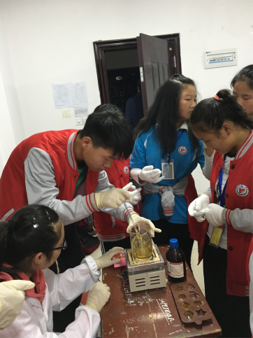 展示环节中,志愿者们详细的演示琥珀的整个制作过程。当看到形态各异的琥珀时,学生们露出了惊讶的表情。实践环节中,每位学生在志愿者的帮助下尝试着自己动手操作,制作出了自己喜欢的琥珀。琥珀制作完成后,学生目光里闪烁着的喜悦,志愿者们由衷的为他们欢欣鼓舞。