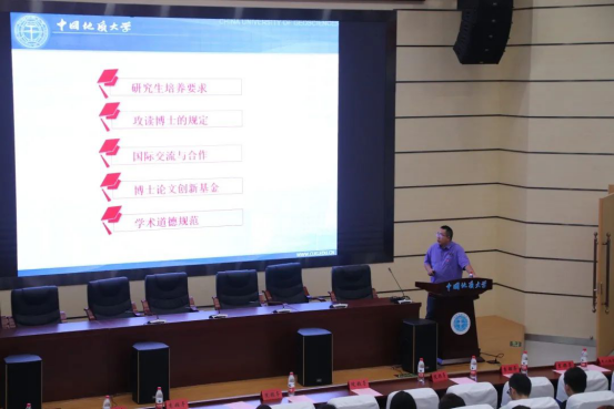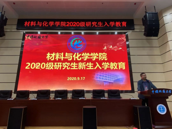 全体起立,奏唱国歌之后,2019届研究生会主席韩聪与2020级研究生新生代表冯颖依次发言,分别表达对新生的祝福和未来科研学习生活的向往。随后,研究生导师代表李珍老师致辞,她代表学院全体导师对2020级研究生新生表示欢迎,并希望同学们瞄准世界科技前沿,投身国家重大发展战略,将眼光放长远,脚踏实地地科研,珍惜研究生生活,坚信同学们在研究生阶段学有所成。紧接着,纳米矿物材料及应用教育部工程研究中心副主任胡波老师带领全体研究生起立,作学术道德诚信宣誓,新生们满怀着对未来学习生活的憧憬和信心,全体起立,举起右手,许下誓言,向全校、全社会做出了庄严承诺。大会的最后,学院党委书记黄菊老师作总结讲话。她代表学院向新入学的233名研究生表示最真诚的祝贺和最热烈的欢迎。同时,她和同学们交流了学习首次全国研究生教育会议精神的体会。一是充分认识党和国家对研究生教育的高度重视和殷切期盼;二是充分认识增强自身实践能力和创新能力的迫切性;三是充分认识“严”的培养方式的必要性。希望同学们不断追求卓越,开拓创新,成为让自己满意、让地大骄傲、让祖国自豪、让世界惊艳的人!