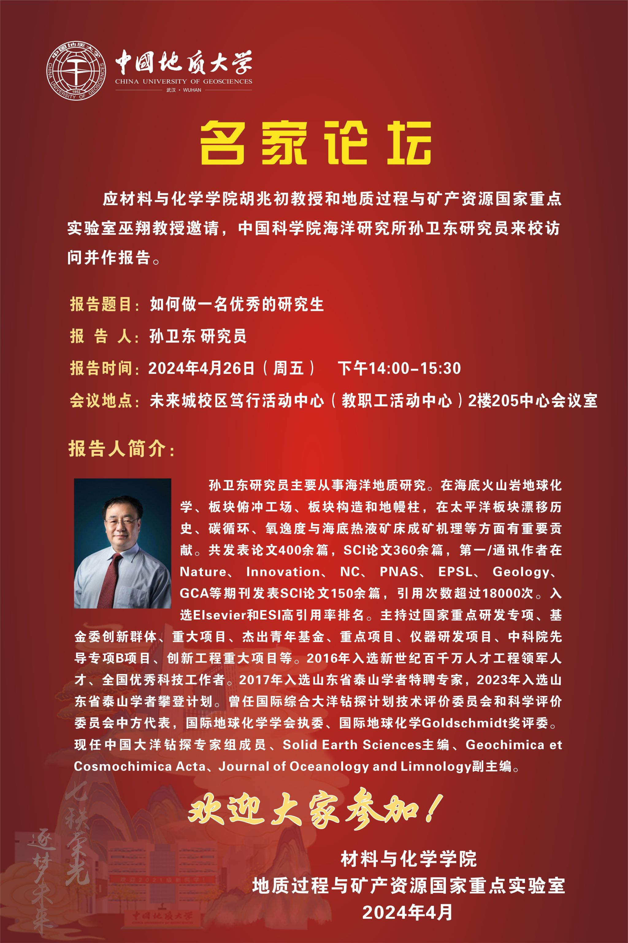 应av网站 及地质过程与矿产资源国家重点实验室邀请,国家自然科学二等奖、安徽省科学技术一等奖获得者,中科院海洋研究所孙卫东研究员将与我院师生交流并讲座。