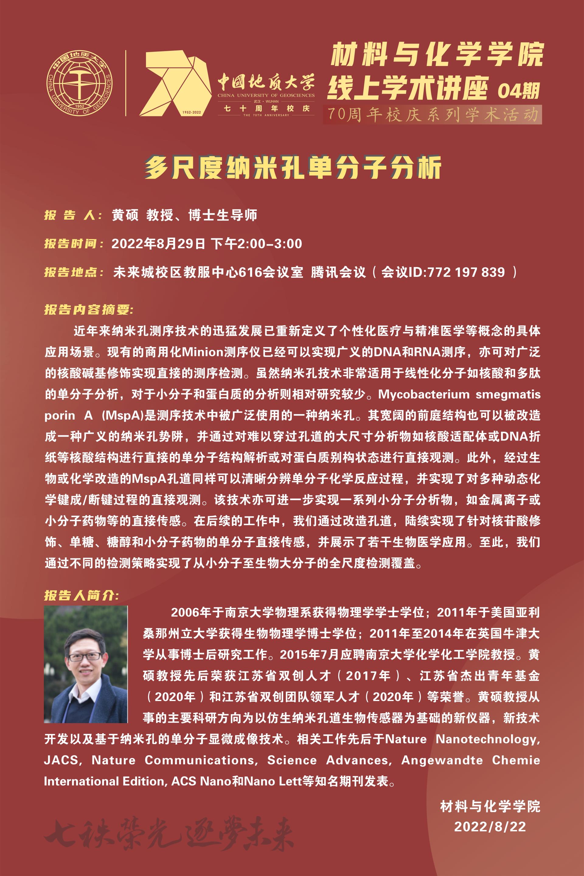 应av网站 邀请,南京大学化学化工学院黄硕教授将与师生交流并讲座。