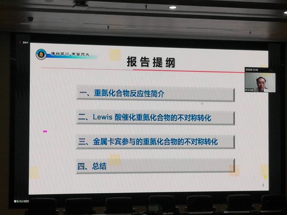 (通讯员 范良)5月19日下午14点,校庆70周年系列学术活动暨校“名家论坛”之一,中科院院士、四川大学化学学院冯小明教授线上学术报告会在未来城校区材化楼110会议室举行。学院百余位师生聆听冯院士报告,并在云端与冯院士交流。