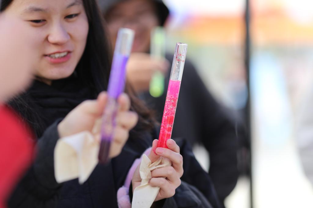 现场动手DIY牛奶香皂、一杯明矾溶液就可以让花朵变成“晶枝玉叶”、摇一摇就可以不断变换的“百变苏打水”、利用化学药品和酸碱指示剂写出五彩的祝福语、私人订制专属护手霜...一场场趣味实验,让观众们惊叹不已,现场掌声不断。