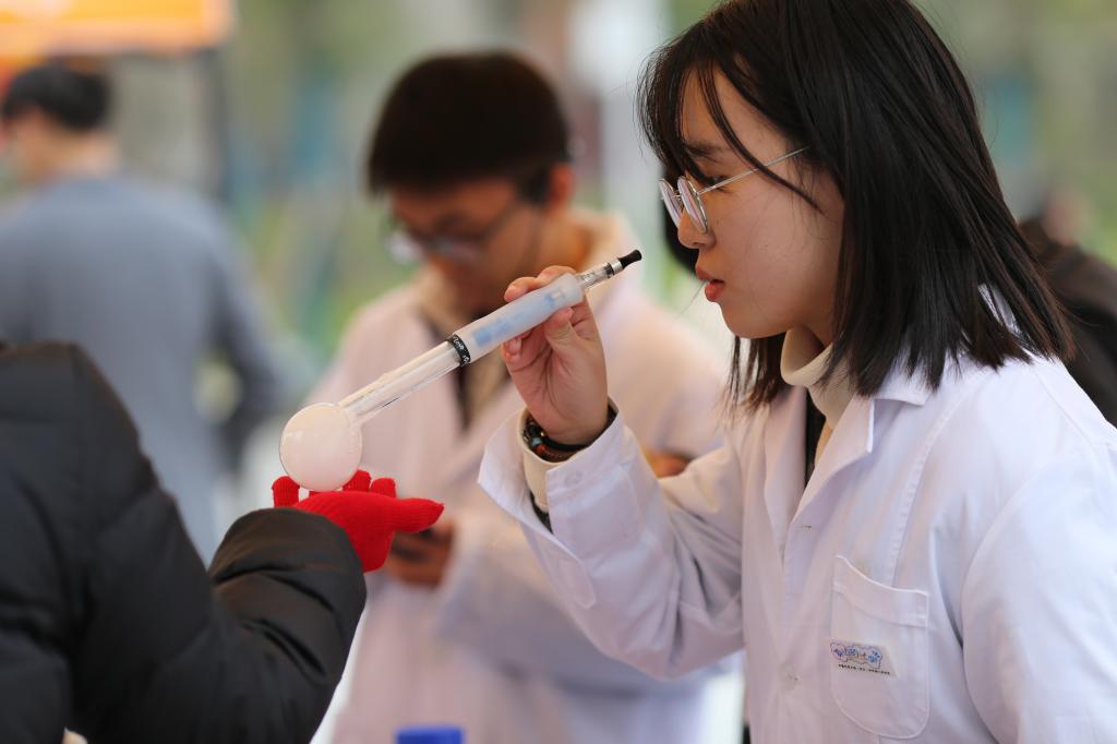 实验展演现场,展演队员们身穿实验服,或本色克隆生产实验场景,或化身各个化学领域的专家现场科普,或手把手指导观众们进行DIY尝试。