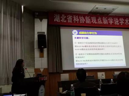 科学技术发展院段平忠副处长出席会议并致欢迎辞,湖北省腐蚀与防护学会副理事长刘宏芳教授致词,我院党委书记黄菊出席本次学术会议。中国腐蚀与防护学会理事、湖北省腐蚀与防护学会常务理事、我院化学系杨丽霞副教授是本次会议的主要组织者之一,并应邀做了“硅烷化预处理在金属表面防护中的应用基础研究”的学术报告。化学系王群英等部分教师及研究生参加了本次学术沙龙活动。